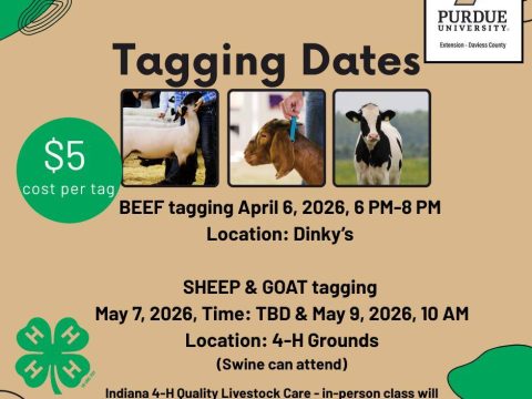 MONTGOMERY — Purdue Extension – Daviess County has released the 2026 tagging schedule for 4-H livestock, including steers, heifers, sheep, and goats. All animals being…