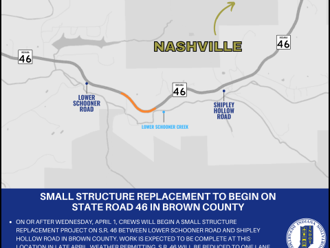 BROWN COUNTY – Indiana Department of Transportation contractor Morphey Construction, Inc., is scheduled to begin a small structure replacement project on State Road 46 in Brown…