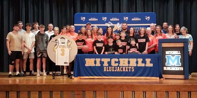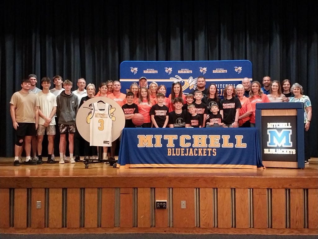 MITCHELL – Mitchell 2024 graduate Dawson Irwin signed Greenville University and is officially a Panther on Tuesday, June 11, at Mitchell High School. His close friends and family gathered to join him.