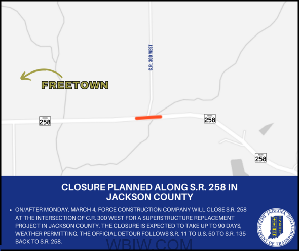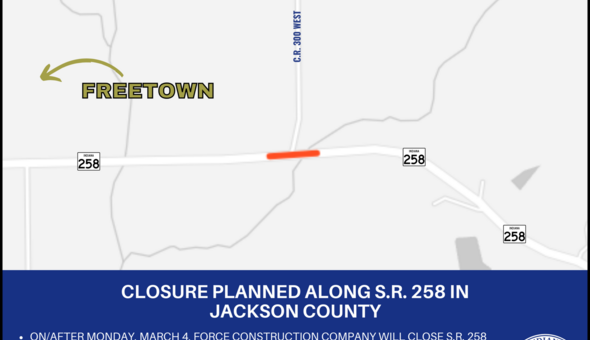 The project will take place at the intersection of S.R. 258 and C.R. 300 West, which is located just over two miles east of Freetown. The closure is expected to take up to 90 days, weather permitting. During the closure, motorists should use the official detour route, which follows S.R. 11 to U.S. 50 to S.R. 135 back to S.R. 258.