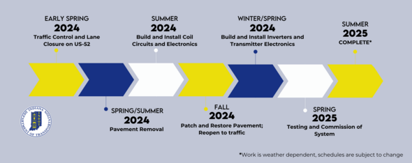The dynamic wireless power transfer test site installation will begin on or after Monday, April 1. At that time, crews will close the westbound right lane on U.S. 231/U.S. 52 to begin pavement removal.