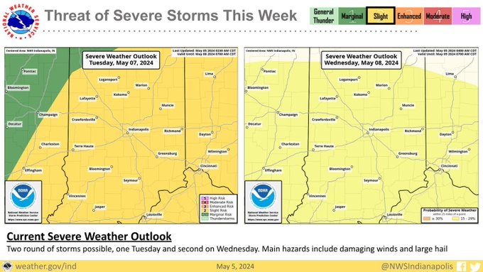On Tuesday, severe weather is threatened from 6:00 a.m. until 2:00 p.m., with rainfall amounts between a quarter and half an inch possible. Temperatures will be around 79 degrees, and southwest winds will be seven to 13 miles per hour, with gusts up to 20 miles per hour. The showers should taper off by the afternoon to early evening.