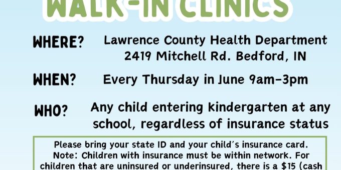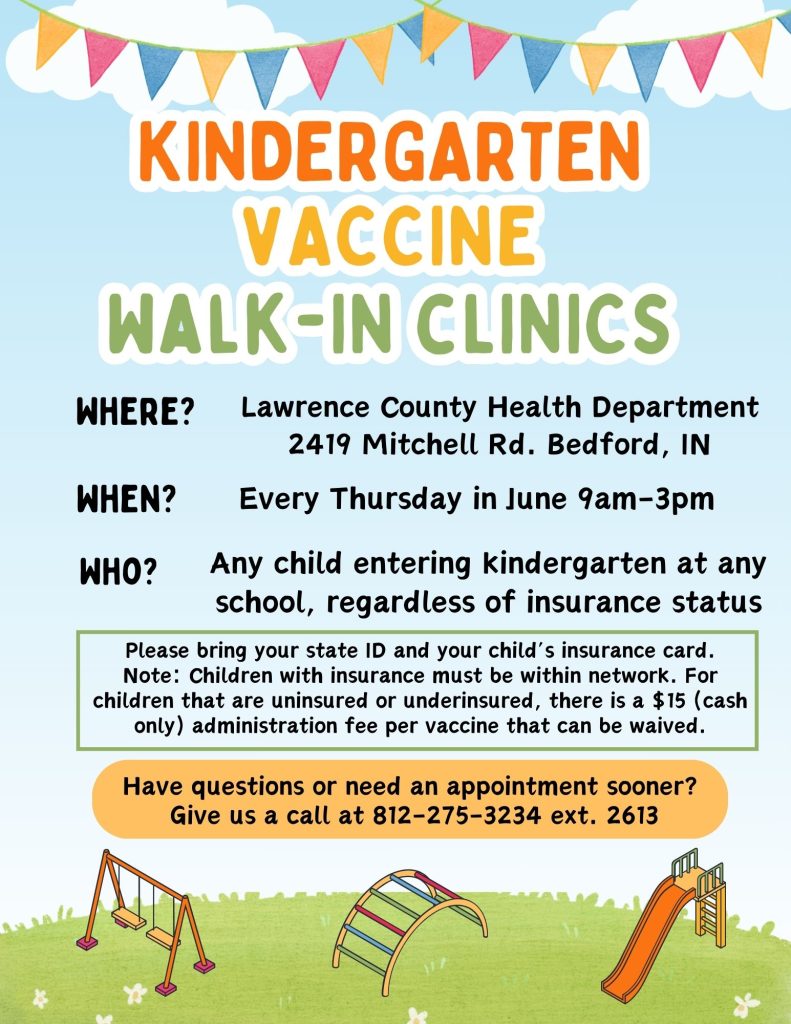 LAWRENCE COUNTY- The Lawrence County Health Department wants to make life easier on parents of children entering kindergarten the coming school year. Every Thursday in June, kids can receive their vaccines at the Health Department at 2419 Mitchell Road in Bedford. There is a waivable $15 administration fee (cash only) for those who are uninsured.