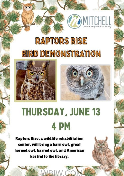 MITCHELL- Have you ever seen a barn owl or an American kestrel? Now’s your chance! Raptors Rise Rehabilitation will bring their raptor ambassadors to the library on Thursday, June 13th at 4 pm. Learn about what it takes to rescue and rehab wild birds of prey, plus see some of our feathered friends up close.