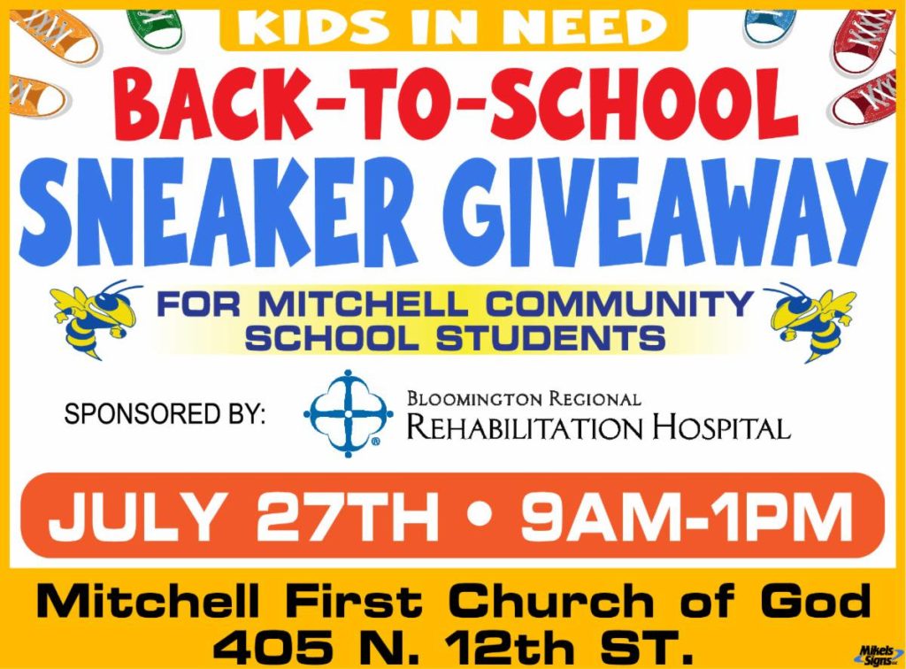 MITCHELL- Mitchell Walking Club is hosting a back-to-school sneaker giveaway at the Mitchell First Church of God in the FMC building next to the church. This event is for students in the Mitchell Community Schools who need help with shoes for school. New sneakers will be given out right before school starts. They are asking parents to have their ID on them to check the address. Students must be present with a parent. Please make sure each student has socks on or with them to try on sneakers. This is a free community service.