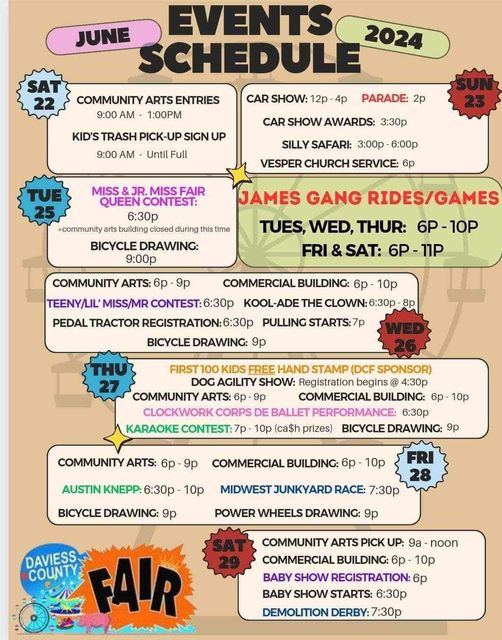 Tonight, everything is back to normal, with $20 for unlimited rides, the Pedal Tractor Pull in front of the stage, Kool-Ade the Clown on the grounds, and the commercial arts and the Creative Arts Building open.