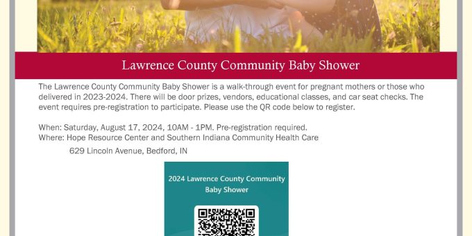 BEDFORD— The Lawrence County Community Baby Shower is a free event designed to support expectant mothers and those who recently delivered in 2023-2024. It will be held on Saturday, August 17th, from 10:00 a.m. to 1:00 p.m. at the Hope Resource Center and Southern Indiana Community Health Care, located at 629 Lincoln Avenue in Bedford, Indiana.