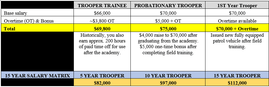 Probationary Troopers graduating from the 87th Recruit Academy who successfully complete their Field Training Officer (FTO) program receive a $5,000 one-time cash bonus (taxable) and regular salary.