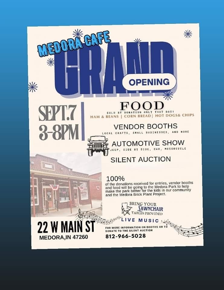 A homestyle meal of ham and beans with cornbread or hot dogs and chips will be available and sold by donation only on that day. Be sure to bring your lawn chair as you enjoy live music while you eat. A silent auction featuring locally donated items will run throughout the event. More donations are always welcome for the auction, and you can find out how to give or reserve a booth by calling 812-966-5028.