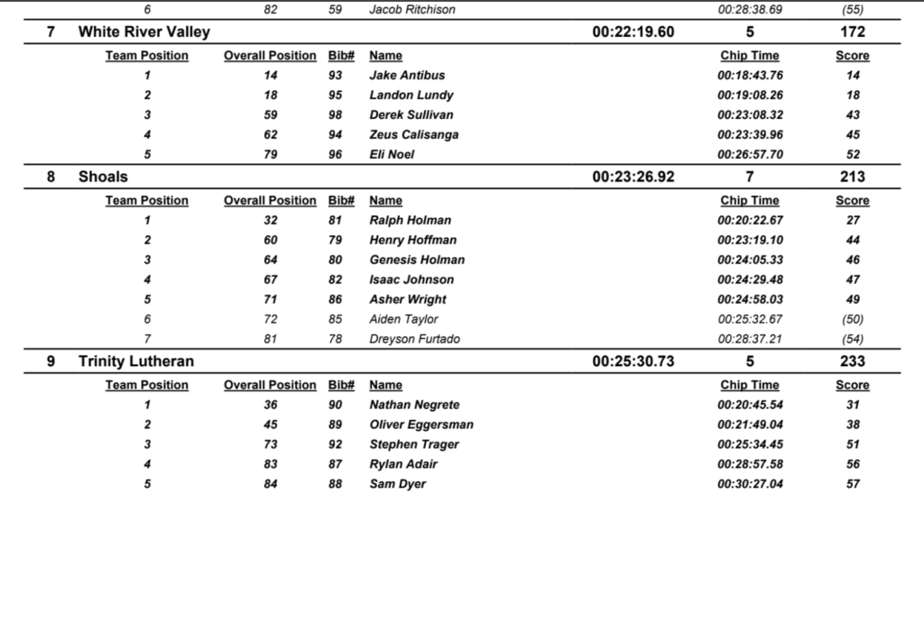 BNL’s other top finishers included Tucker Inman (12th in 18:28.34), Nick Lindley (13th in 18:40.77), Alex Nicholson (17th in 18:59.00) and Eli McFarland (25th in 19:49.40).