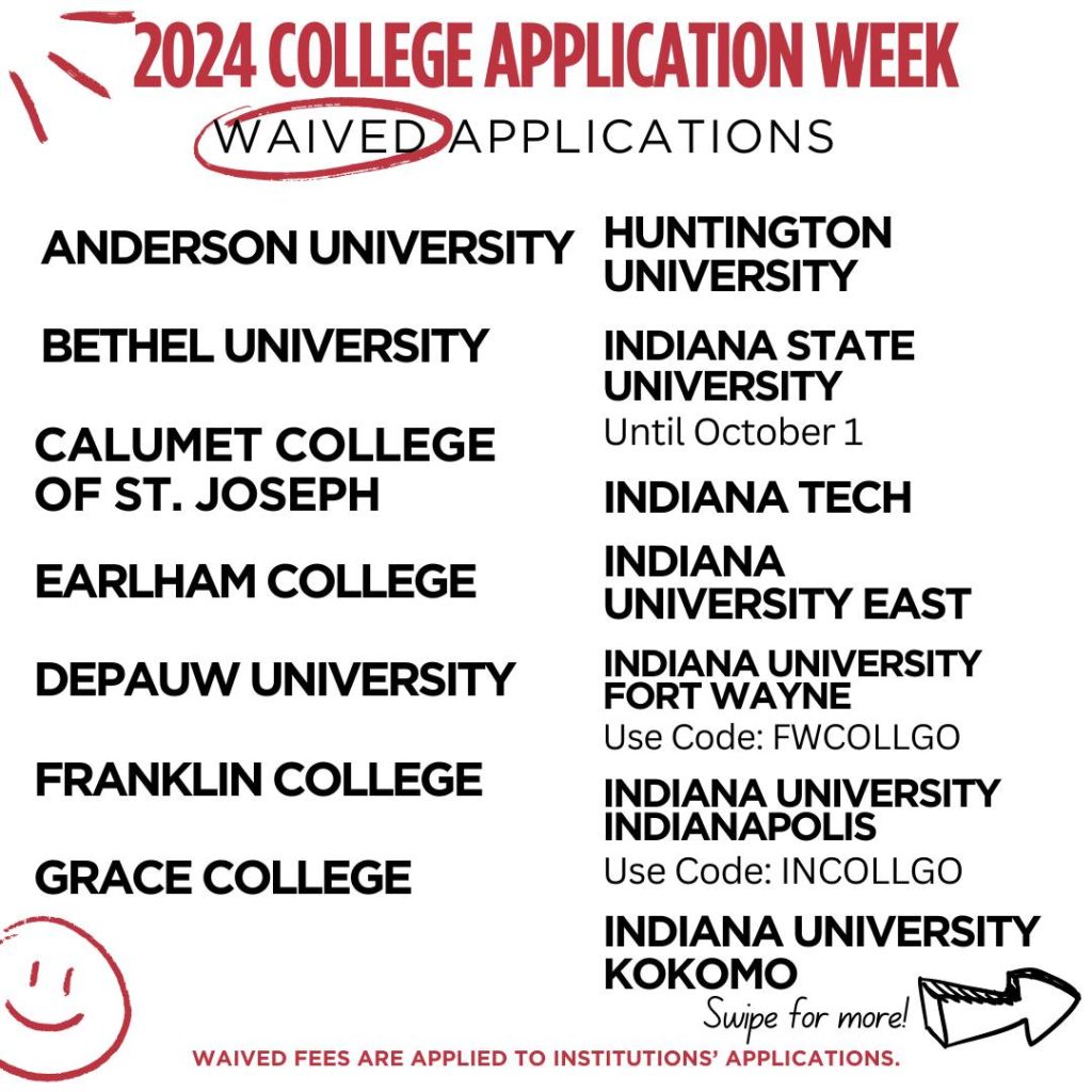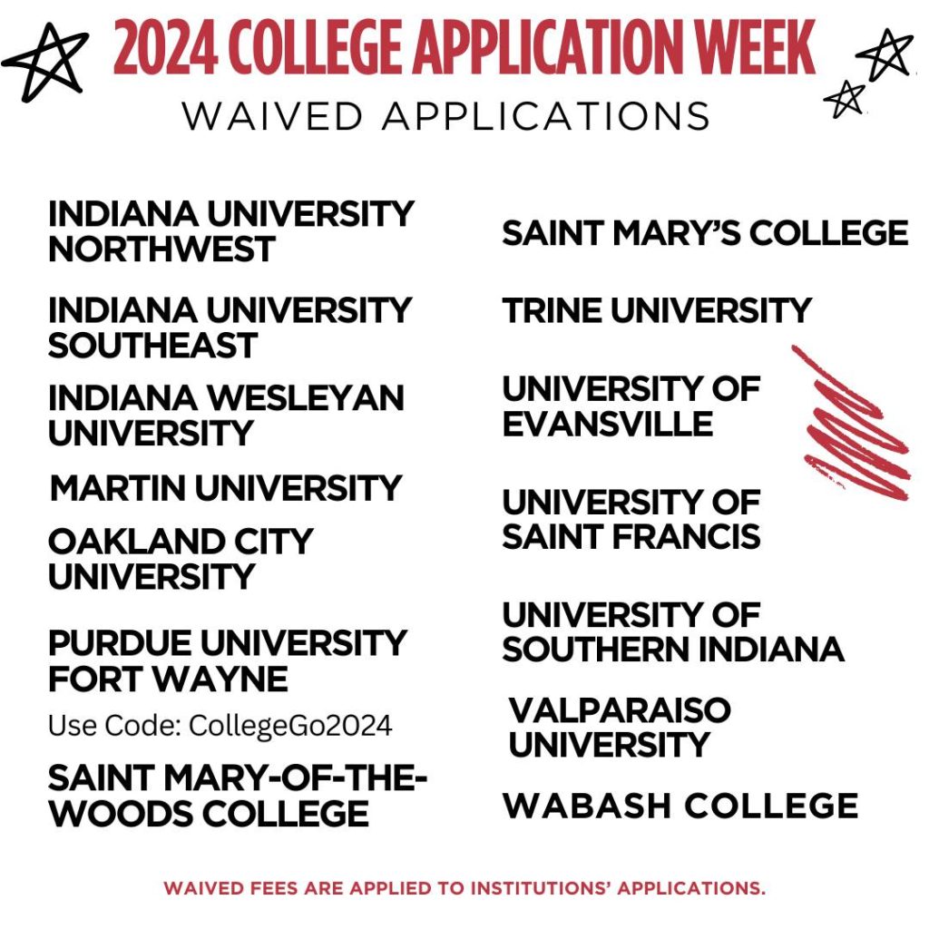 Many Indiana universities join in the celebration by taking away their college application fees for a week or longer so that students can apply for free. The dates for 2024 are September 23-27, and the following colleges and universities are participating in the program: