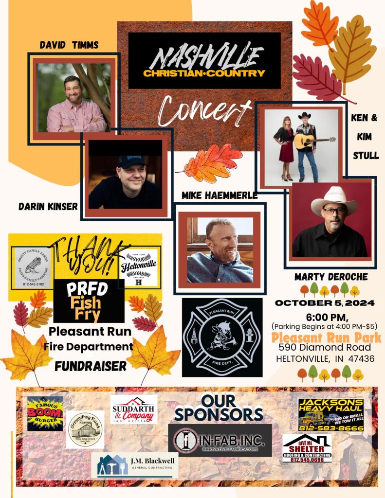 HELTONVILLE—Make sure you are in Heltonville on October 5th for a night you won’t want to miss. Nashville Christian Country will perform live in concert to accompany the Pleasant Run Fish Fry, inflatables for the kiddos, and memories that will last forever. The event will be at Pleasant Run Park, 510 Diamond Road, Heltonville. Parking is $5 and starts at 4 p.m., followed by the concert at 6 p.m. For more information or to sponsor the event, reach out through Facebook here.