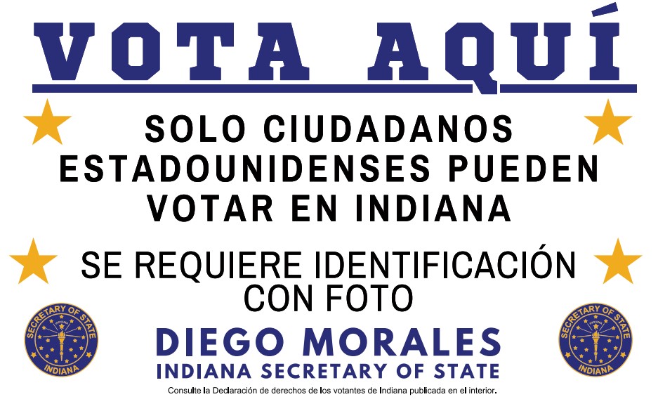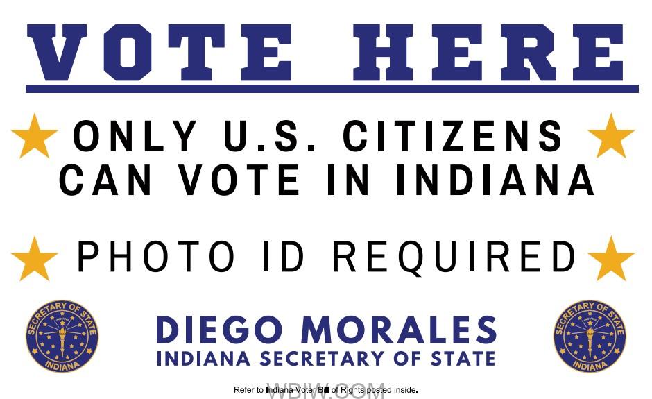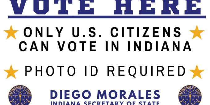 INDIANA – Indiana Secretary of State Diego Morales announces the placement of new ‘Vote Here’ signage at polling locations across the state, underscoring key voter requirements to maintain the integrity of Indiana’s elections. The signs will clearly state that only U.S. citizens are eligible to vote in Indiana elections and that a valid photo ID is required for all voters.