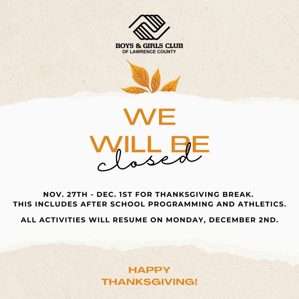 Posted in Local The Boys and Girls Club of Lawrence County announce Thanksgiving break shutdown November 23, 2024 LAWRENCE COUNTY- The Boys and Girls Club of Lawrence County has announced it will close November 27 through December 1 for Thanksgiving Break. All activities will resume as usual December 2.
