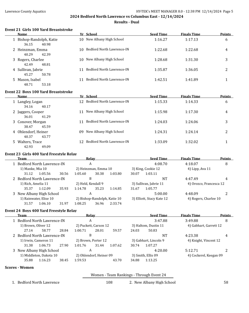 BEDFORD – Bedford North Lawrence swept to wins over New Albany during high school swimming action on Saturday.