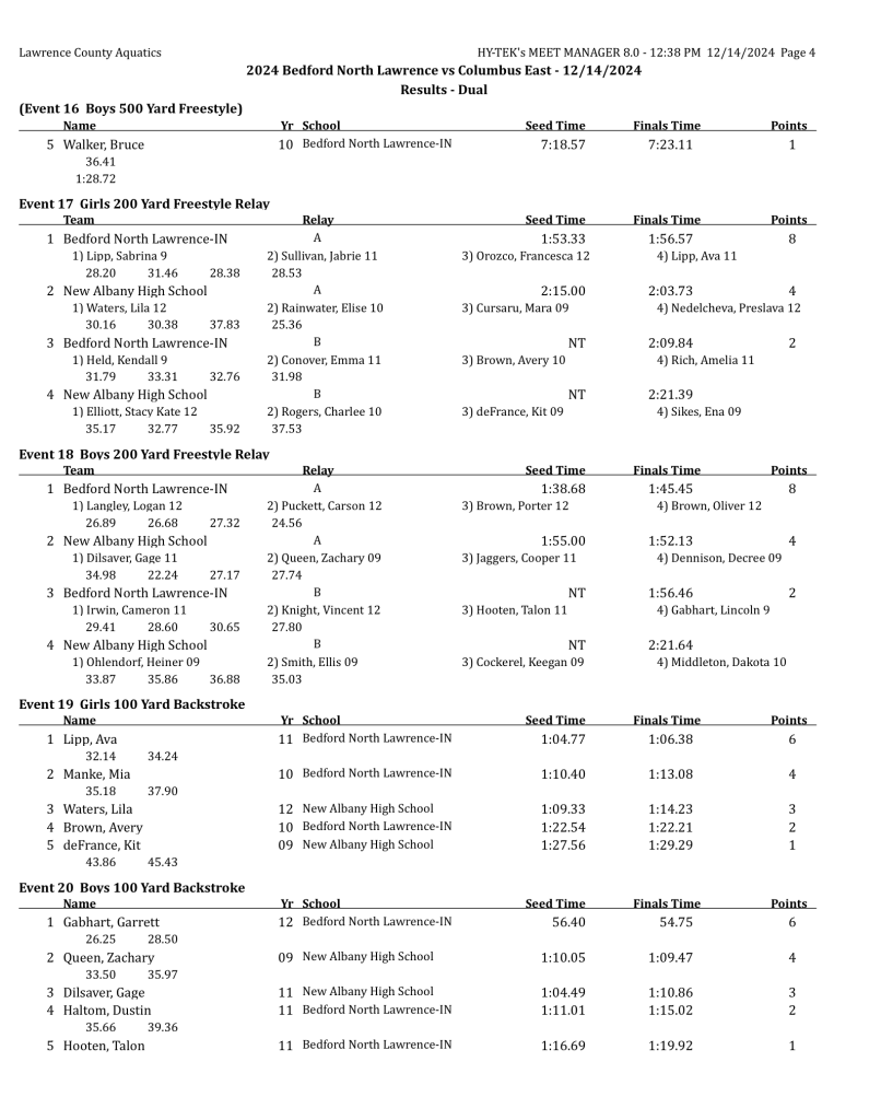 In the relays, Dustin Haltom, Langley, Gabhart and Porter Brown combined to claim the 200 medley relay (1:52.94). Langley, Puckett, Porter Brown and Oliver Brown won the 200 free relay (1:45.45), while Oliver Brown, Puckett, Haltom and Gabhart took the 400 free relay (3:49.88).