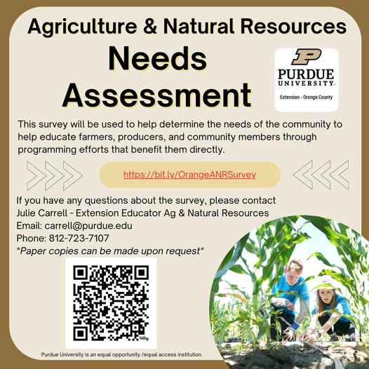 ORANGE COUNTY- Purdue Extension of Orange County is conducting a survey to help determine the local community’s needs and gauge interests. Orange County Extension Staff will use the collected data to provide community members, farmers, and producers with the most in-demand programs.