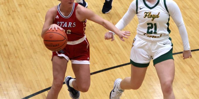 GALENA – Floyd Central’s Brinley Clark works in the post against Miley Sherrill.
