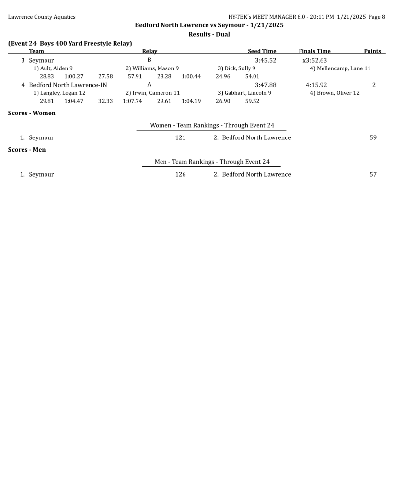 BEDFORD – Seymour stole the show, crashing Bedford North Lawrence’s Senior Night celebration with a sweep of the Stars during high school swimming action on Tuesday night.
