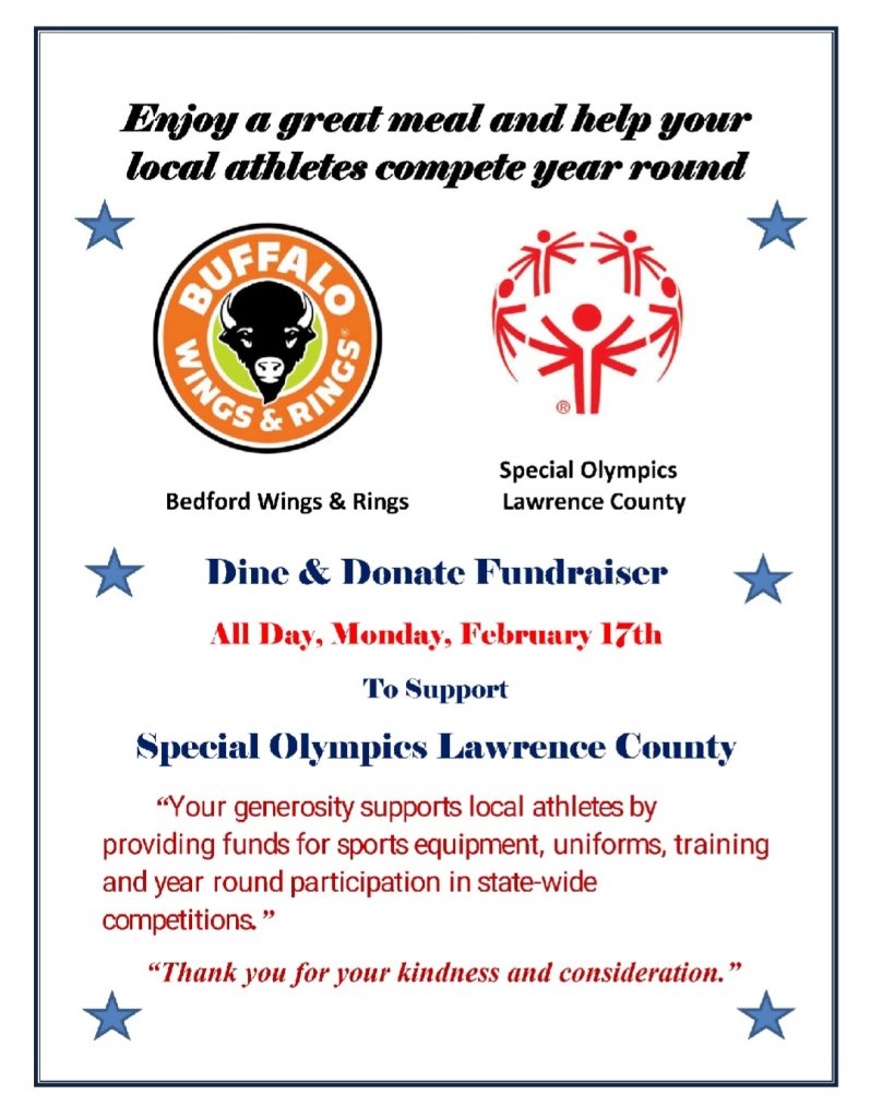 BEDFORD– Local restaurant Buffalo Wings & Rings is teaming up with Special Olympics Lawrence County for a special Dine & Donate Fundraiser on Monday, February 17.