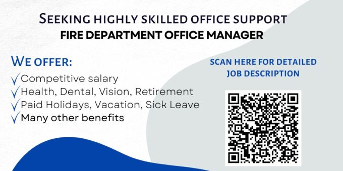 BEDFORD- The Bedford Fire Department is seeking a highly skilled office manager. The ideal candidate must excel in communication, organization, typing, various computer software programs, and many administrative tasks as assigned. For a full job description, scan the QR Code below or visit https://www.bedford.in.us/HDI_JobApplication.aspx.