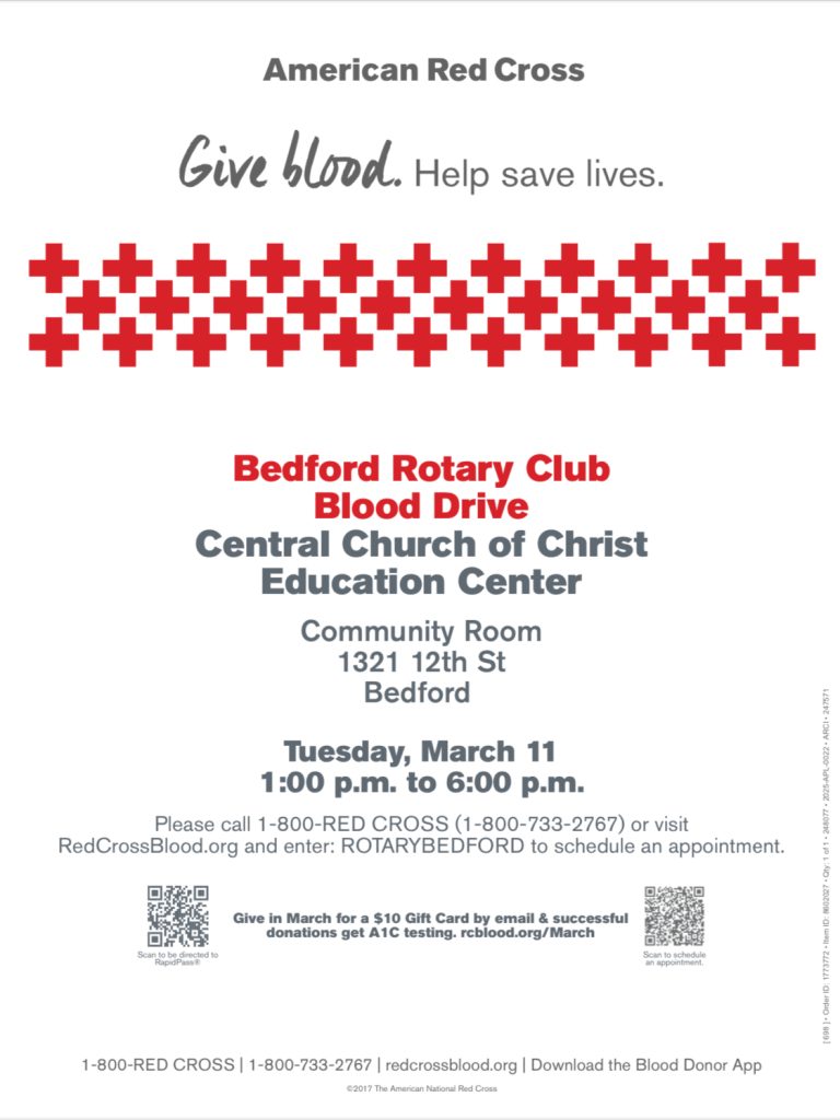 BEDFORD– The Bedford Rotary Club is sponsoring an American Red Cross Blood Drive on March 11 at the Central Church of Christ Education Center, 1321 12th Street. The event will run from 1 to 6 p.m. and aims to help meet the ongoing demand for blood donations. Donors of all blood types are encouraged to participate. To schedule an appointment call 1-800-RED CROSS or visit RedCrossBlood.org and enter ROTARYBEDFORD. Walk-ins are also welcome.