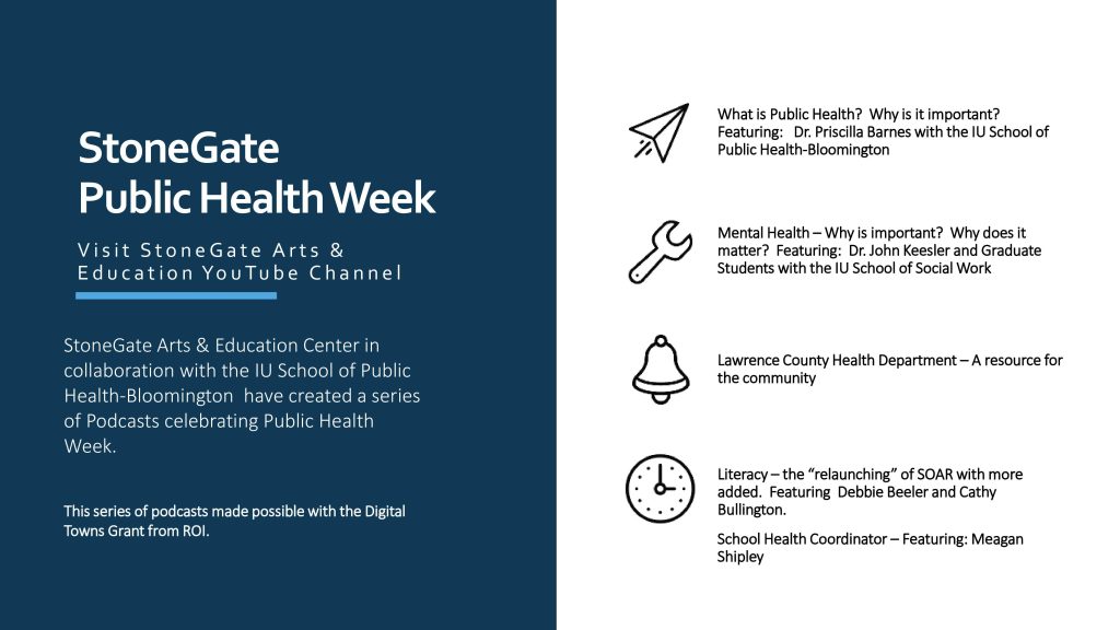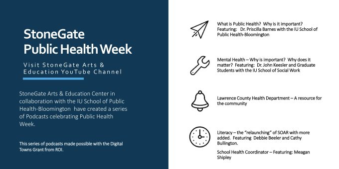 BEDFORD – StoneGate Arts & Education Center, in collaboration with the IU School of Public Health-Bloomington, has created a series of podcasts to celebrate Public Health Week.