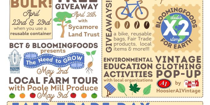 BLOOMINGTON – Join Bloomingfoods from Tuesday, April 22nd, through Saturday, May 10th, in celebrating Earth Day and Fair Trade Day. Encourage everyone to make every day Earth Day and create a higher demand for sustainable and ethically sourced goods.
