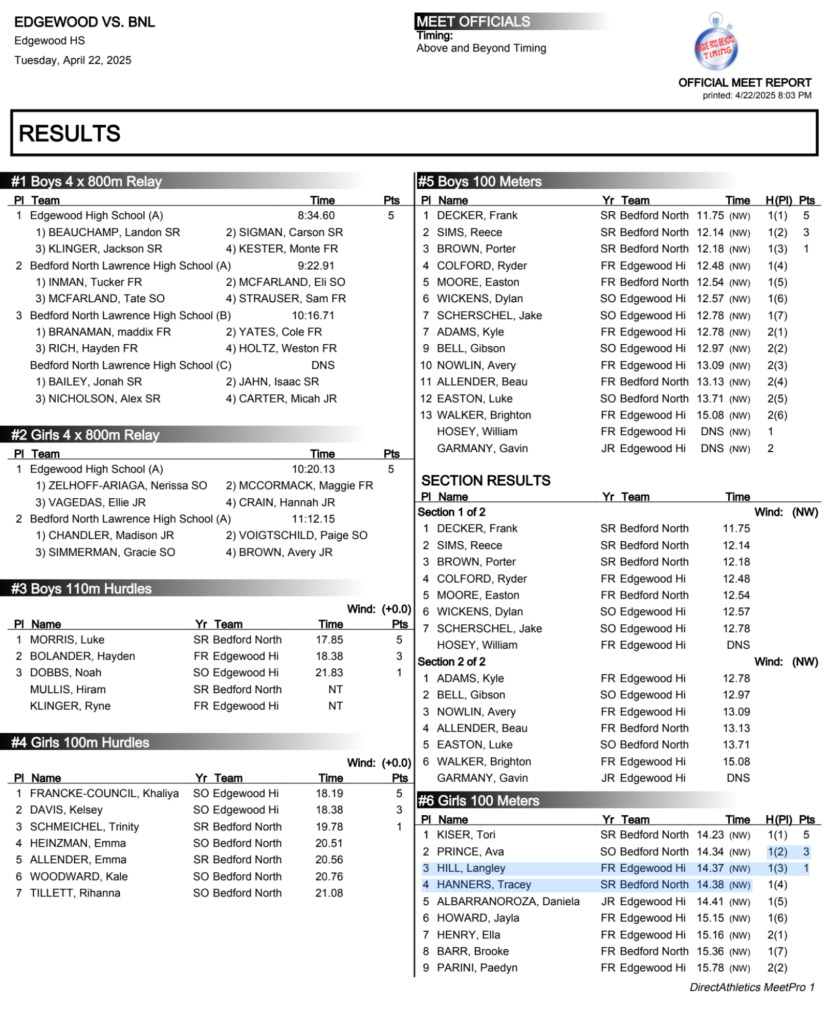 ELLETTSVILLE – Bedford North Lawrence won 11 events while conquering Edgewood during boys high school track action on Tuesday.
