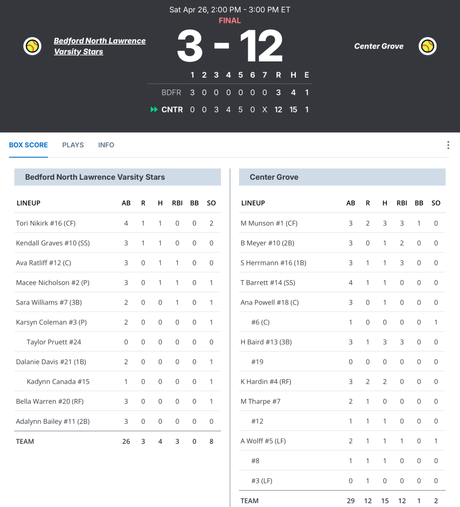 Against Center Grove, BNL had three straight hits during the three-run first as Ratliff (RBI single), Nicholson (RBI double) and Williams drove in the runs. But BNL would add only one more hit after that, as Center Grove hurler Sarah Riley struck out 8.