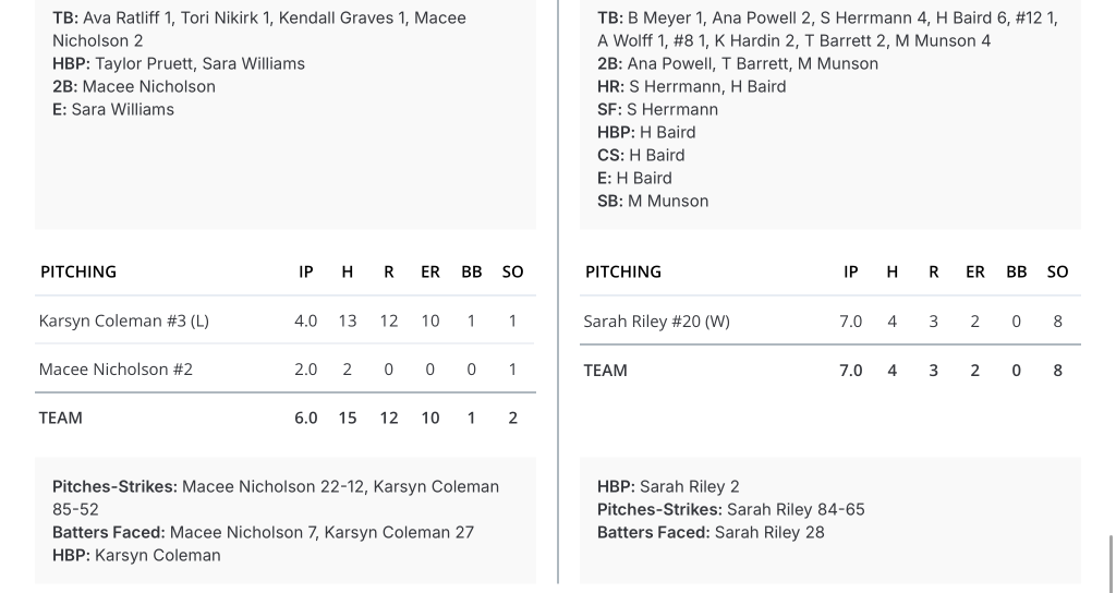 Macee Nicholson earned the win in the circle, allowing only three earned runs. Nikirk, Graves, Nicholson, Williams and Adalynn Bailey had two hits each.