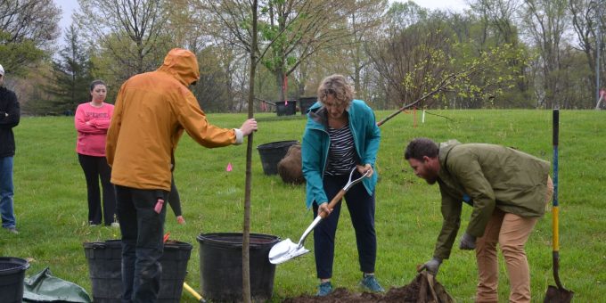 BLOOMINGTON–More than 40 volunteers met on a drizzly morning, April 25, for an Arbor Day ceremony and to help Parks and Recreation’s urban forestry staff plant 15 new trees north of the playground in Olcott Park.