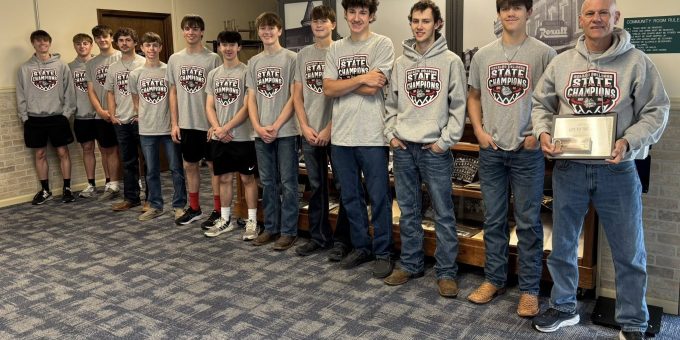 ORLEANS—Orleans Town officials recognized Coach Tom Bradley and the IHSAA Class 1A State Champions, the Orleans Bulldogs, during their regular monthly general work session held Wednesday morning at Town Hall. Council members passed a formal resolution honoring the team for all its accomplishments this past season and presented the team and Coach Bradley with the “Key to the Town of Orleans.”