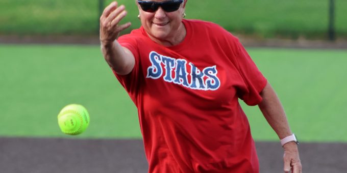 Former BNL coach Jo Underwood, who started the program in 1984, throws the ceremonial first pitch prior to Wednesday’s clash with Jeffersonville. The Stars topped the Red Devils 10-4.