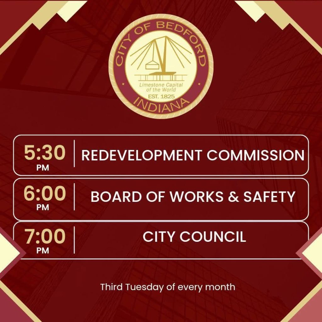 The city also announced that a live stream of the meetings will be available on the City of Bedford, IN, Facebook page for those unable to attend in person. These meetings are regularly held on the third Tuesday of every month.