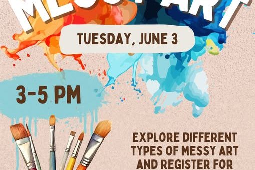 The event invites participants to explore different types of messy art and offers an opportunity to register for the library’s summer reading program. Attendees are encouraged to “dress for mess.” The event’s theme is “Color Our World.”