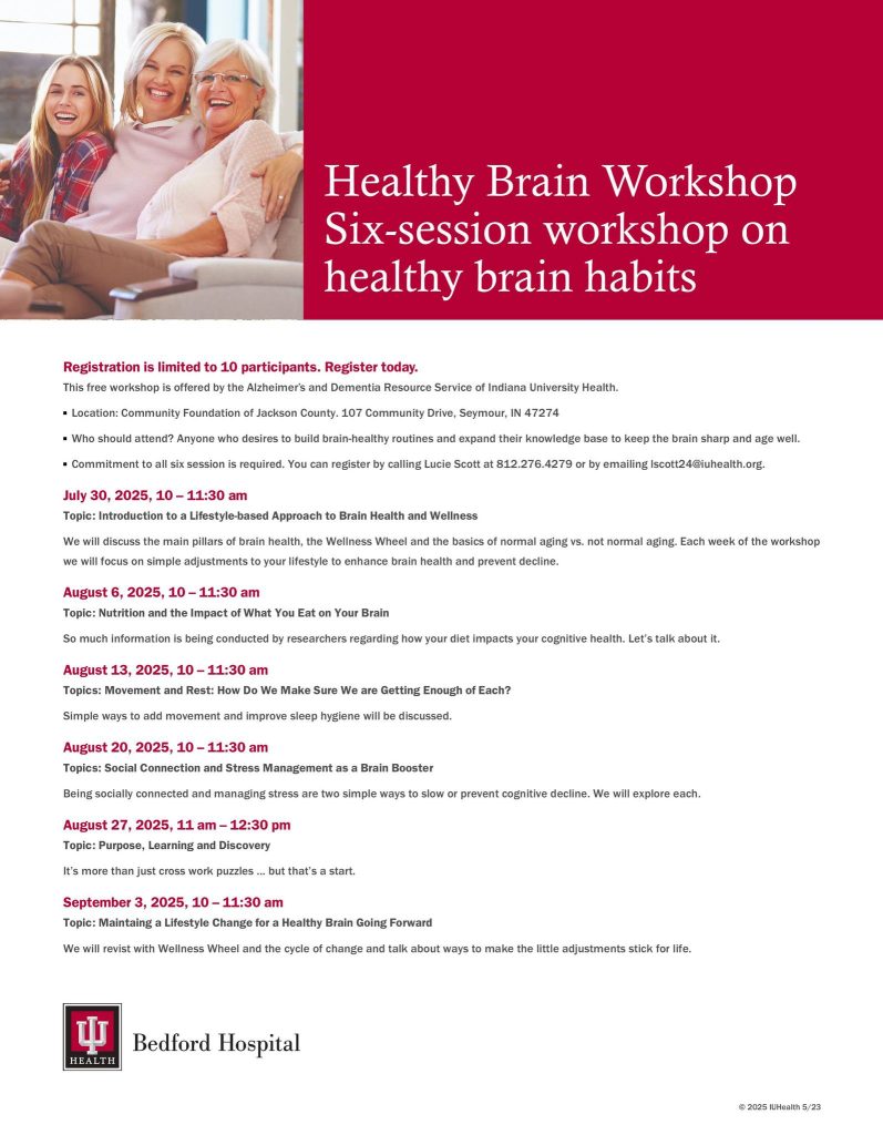 SEYMOUR — Do you want to build brain-healthy routines and expand your knowledge base to keep your brain sharp and age well? IU Health, in partnership with the Alzheimer’s and Dementia Resource Service of Indiana University Health, is offering a free six-session workshop on healthy brain habits.