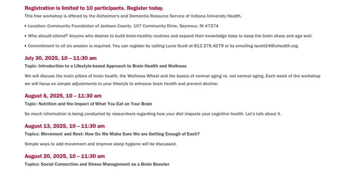 SEYMOUR — Do you want to build brain-healthy routines and expand your knowledge base to keep your brain sharp and age well? IU Health, in partnership with the Alzheimer’s and Dementia Resource Service of Indiana University Health, is offering a free six-session workshop on healthy brain habits.
