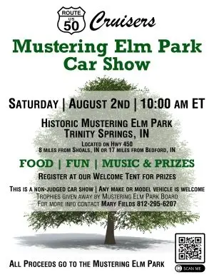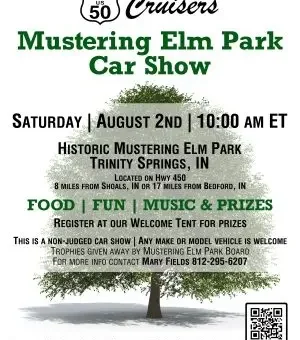 TRINITY SPRINGS – Car enthusiasts are invited to showcase their rides and enjoy a day of automotive camaraderie at the Route 50 Cruisers Car Show on Saturday, August 2nd, starting at 10:00 AM ET. The event will take place at the historic Mustering Elm Park in Trinity Springs, conveniently located on Highway 450, approximately 8 miles from Shoals and 17 miles from Bedford.