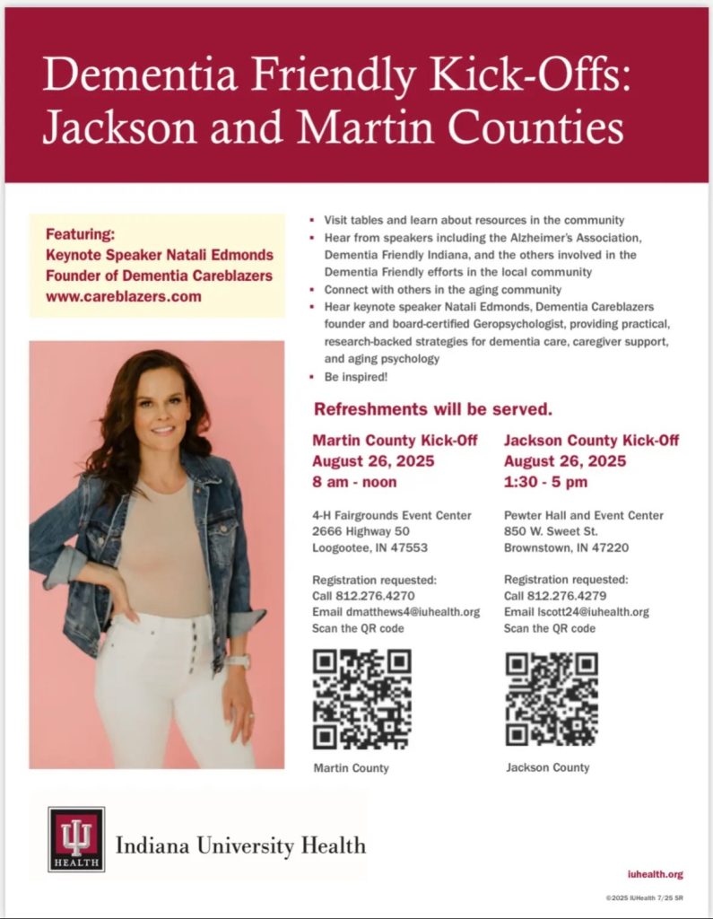 The free events, featuring keynote speaker Natali Edmonds—founder of Dementia Careblazers and a board-certified geropsychologist—will include resource tables, community speakers, and opportunities to connect with others in the aging community. Martin County’s event will run from 8 a.m. to noon at the 4-H Fairgrounds Event Center in Loogootee, while Jackson County’s event is scheduled from 1:30 to 5 p.m. at Pewter Hall and Event Center in Brownstown. Attendees are invited to register by calling or emailing IU Health contacts or scanning the provided QR codes. Refreshments will be served.