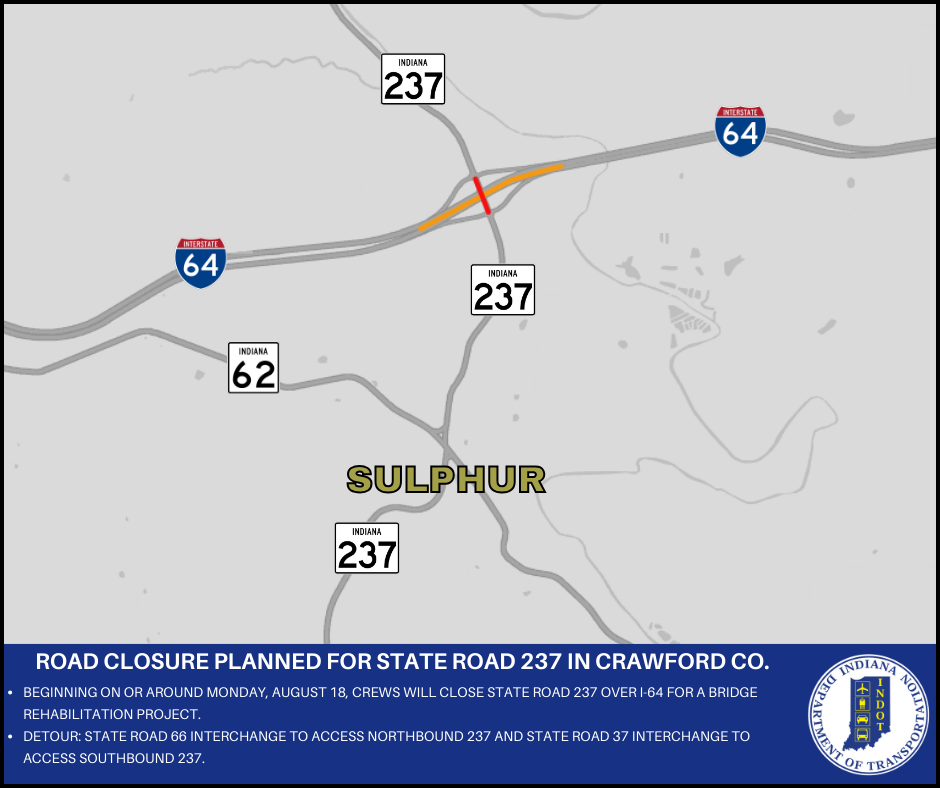CRAWFORD CO. – The Indiana Department of Transportation announces a road closure for State Road 237 in Crawford County.