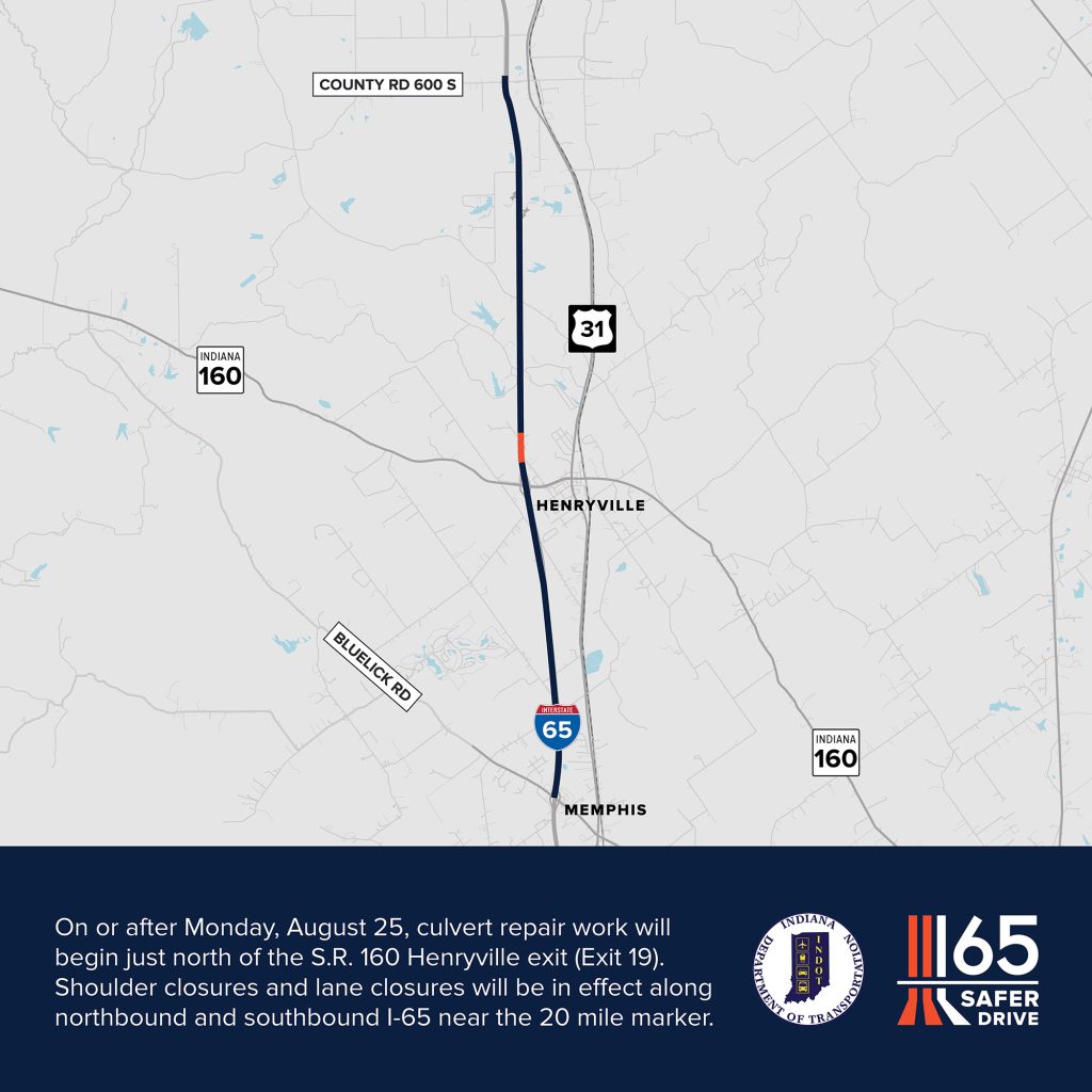 On or after Monday, August 25, culvert repair work will begin just north of State Road 160 in Henryville (Exit 19). Drivers can expect shoulder closures and overnight lane closures along northbound and southbound I-65 near the 20-mile marker (MM 20) through late November, weather permitting.