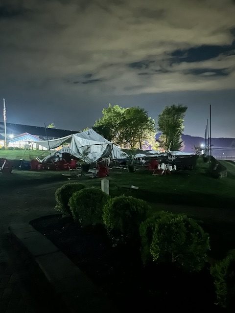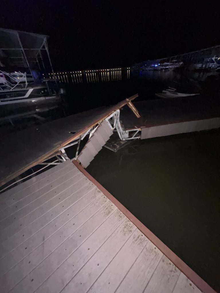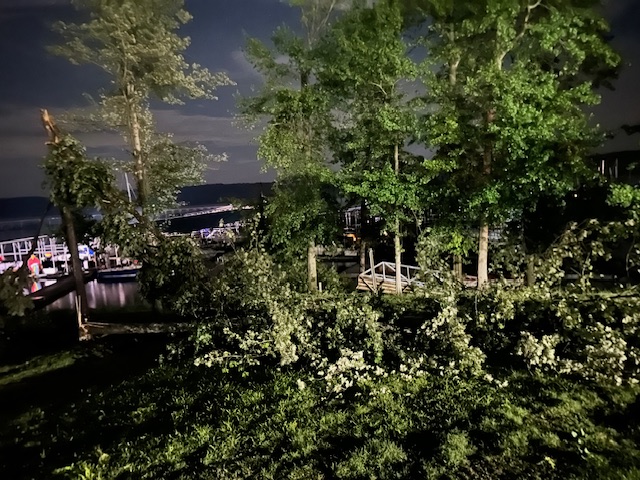 Firefighters, marina staff, and conservation officers worked together through the early morning hours to safely shuttle boaters back to shore. The storm also caused other damage on the property, including downed trees and the destruction of an event tent.