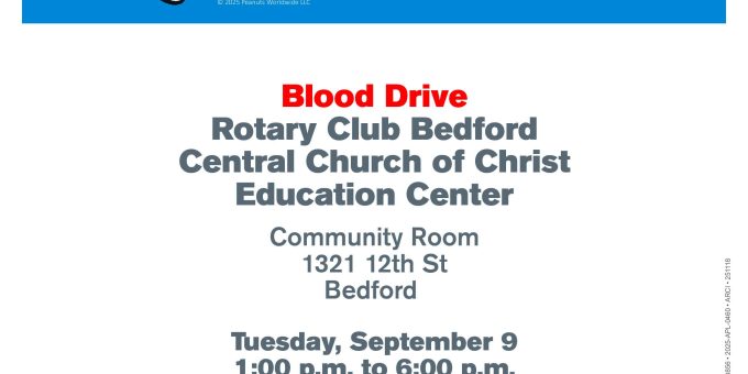 BEDFORD — The Bedford Rotary Club and the American Red Cross are teaming up to host a blood drive on Tuesday, September 9th, from 1:00 p.m. to 6:00 p.m. The event will be held in the Community Room of the Central Church of Christ Education Center, located at 1321 12th Street.