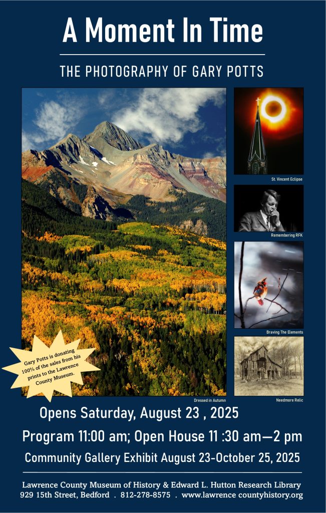 For more information about Gary Potts, his photo exhibition, or the Community Gallery at the Lawrence County Museum of History, call 812-278-8575, visit the museum website at