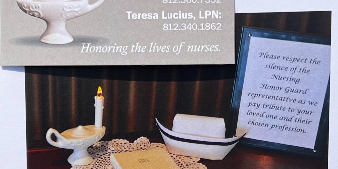 To request the Nursing Honor Guard’s services, a funeral home director should contact the Honor Guard’s representative, RN Janet Conder, at 812-360-7332 or LPN Teresa Lucius at 812-340-1862.