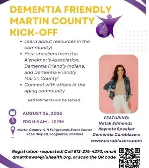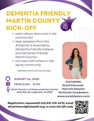 LOOGOOTEE — A kick-off event for the Dementia Friendly Martin County initiative is set for August 26, 2025, at the Martin County 4-H Fairgrounds Event Center. The event will run from 8 a.m. to 12 p.m. at 2666 Highway 50, Loogootee.