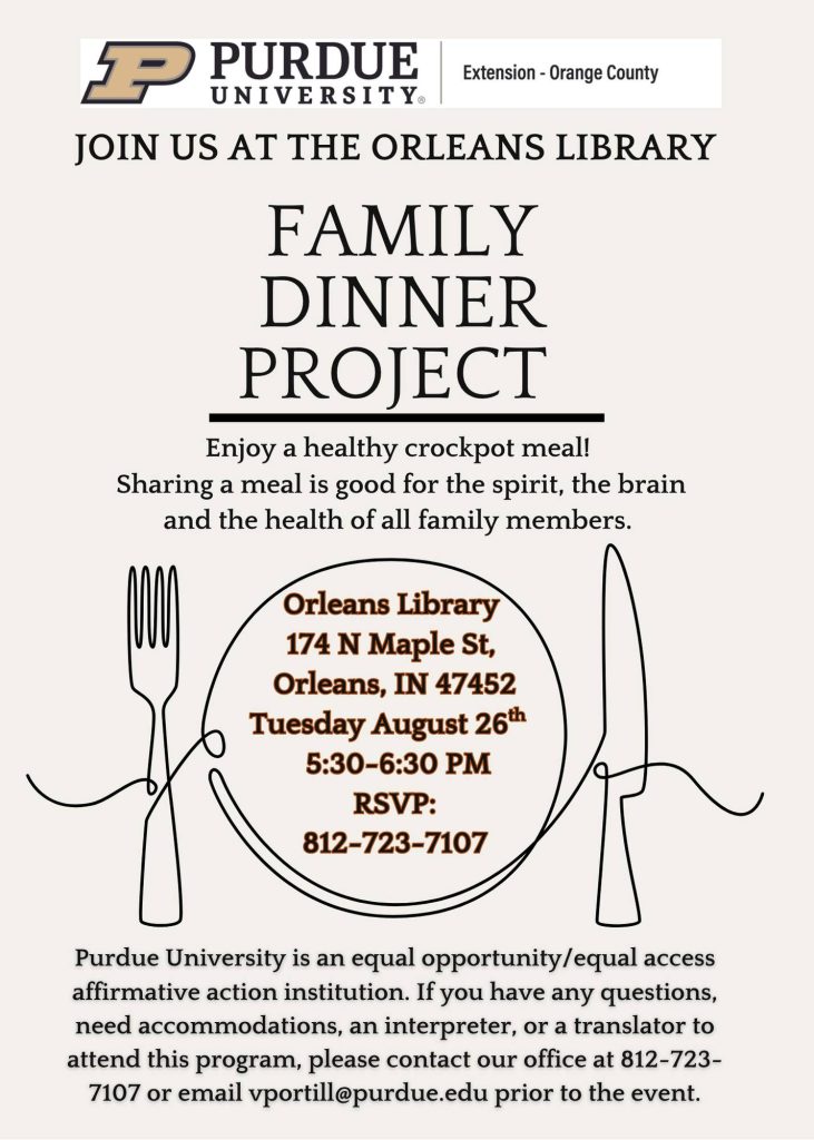 Families of all sizes are welcome. Registration is encouraged by calling 812-723-7107 or emailing vportill@purdue.edu.