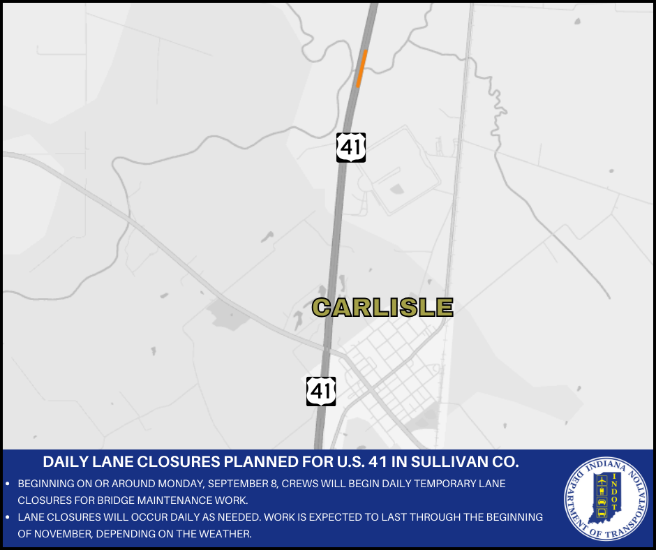 Beginning on or around Monday, September 8, crews will begin daily temporary lane closures on U.S. 41 near Carlisle. These closures will occur over Busseron Creek.