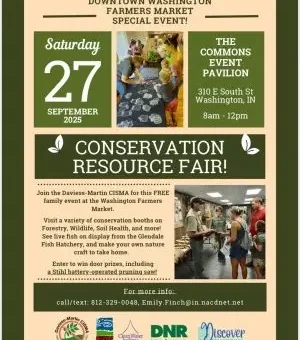 WASHINGTON – The Washington Farmers Market will host a special Conservation Resource Fair next Saturday, September 27, at The Commons Event Pavilion from 8 a.m. to noon. This free, family-friendly event, organized by the Daviess-Martin CISMA, aims to educate the public about local conservation efforts.